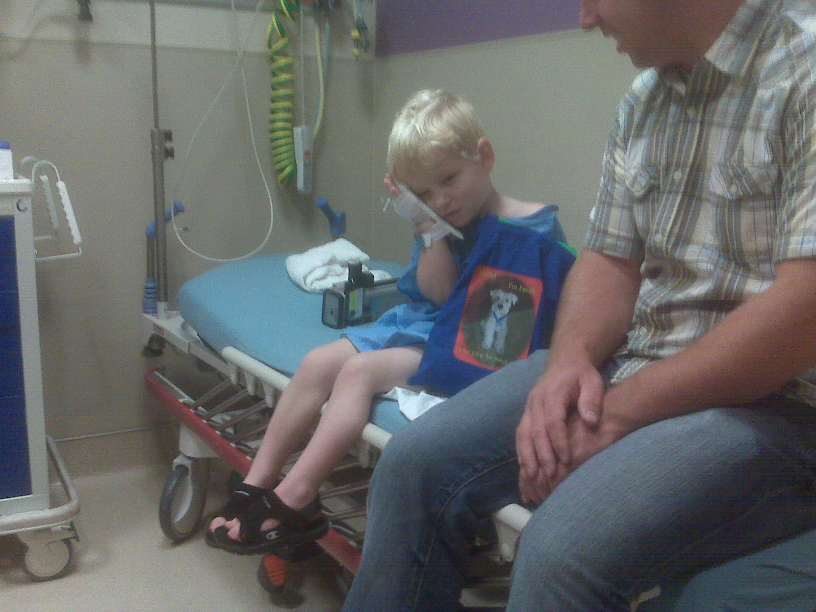 Wyatt was having a hard time kicking strep throat in July and it turned out that he had a throat abscess and had to be hospitalized. Thankfully rather than doing surgery to drain the swollen gland they treated him with IV antibiotics and steroids. We were in the hospital for four days. It was tough because he felt fine after the first day but still had to stay hooked up to an IV which limited his activity. Keeping a three year old still enough to keep the IV from coming out wasn't easy. But we got through it and he was very brave. Now he tells everyone he sees, "Hi, my name is Wyatt and I went to the hospital." Everyone from the cashier at the store to a stranger walking down the street. And he'll tell you all about it if you'll let him. He's cute!